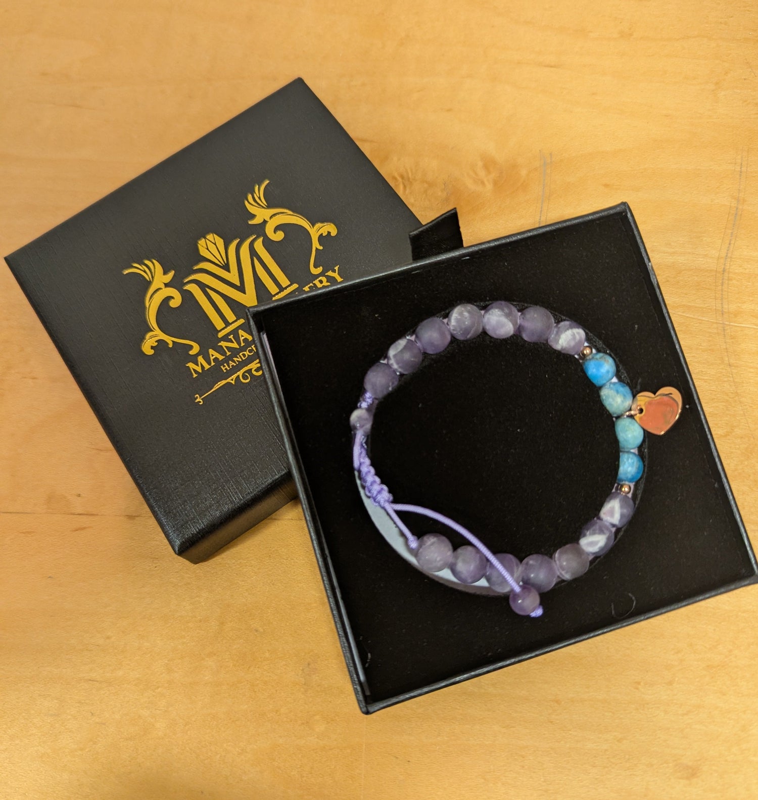 This beautiful bracelet was made in Canada from amethyst and apatite gem stones.