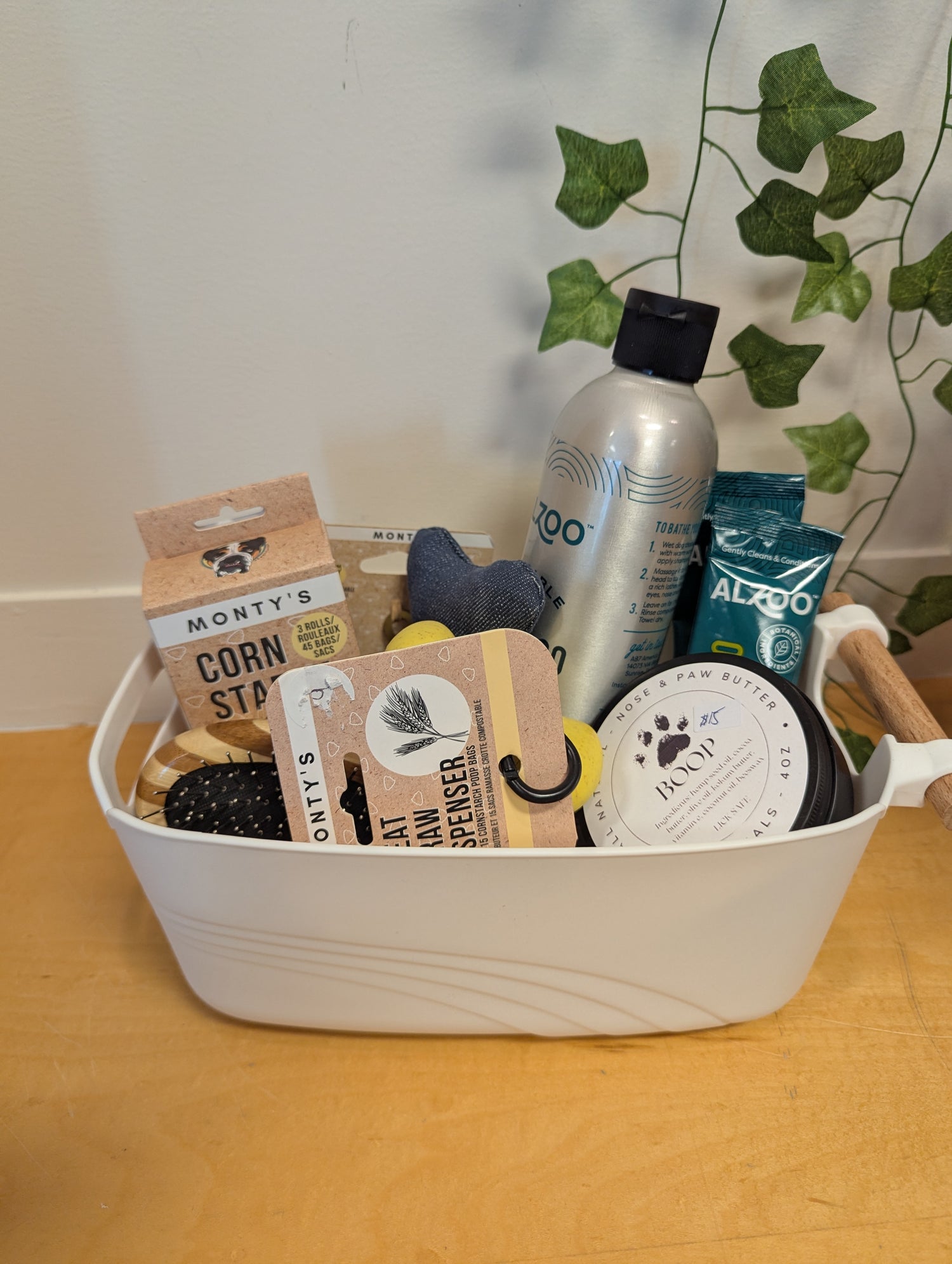 Did you want to say congratulations on someone's new dog? Give them a thoughtful gift basket which includes: a reusable stainless steel bottle to fill with dog shampoo with 2 accompanying concentrated dog shampoo powders that you just add water to to create a liquid dog shampoo. Made by a brand called Alazoo and is vanilla scented.